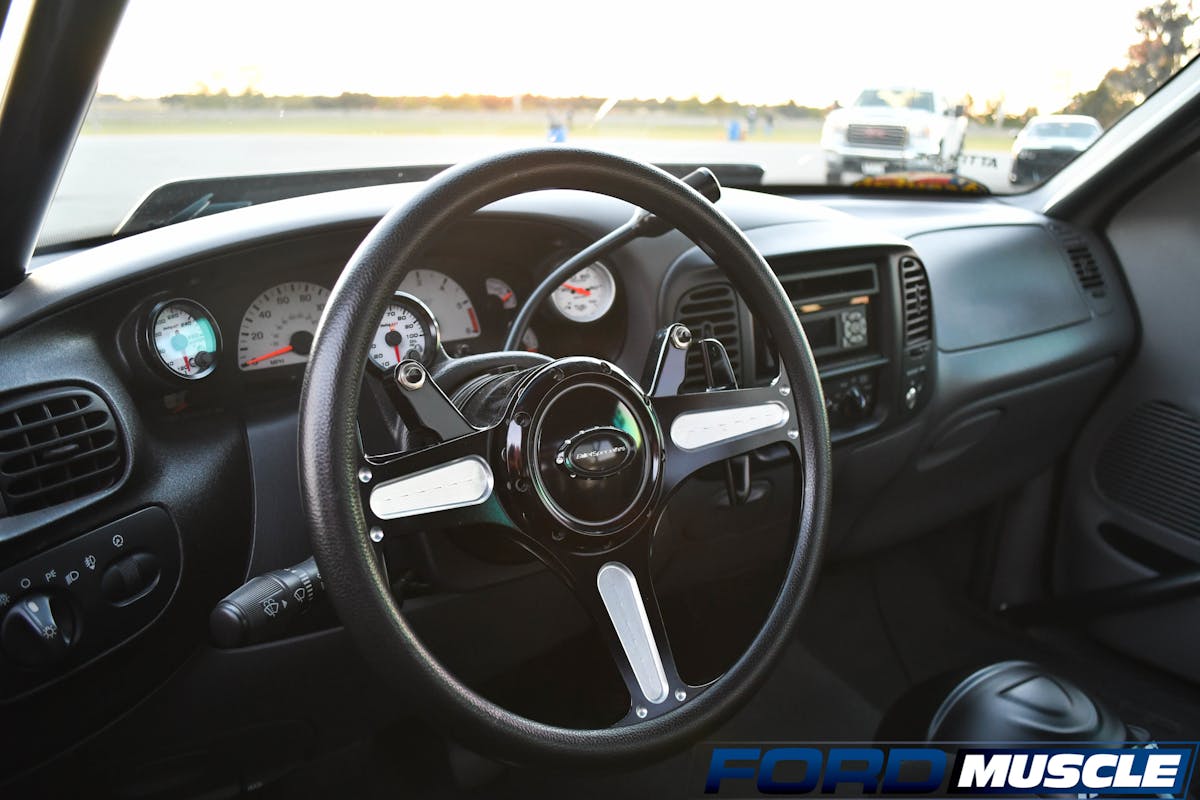 “The most challenging part of the build was to not chop up a truck that I’ve owned since new, and still make the big power combo work with all the factory restraints. The cage is tucked in so tightly that you almost can’t tell it’s there,” Albino says. “The interior is all stock and all there. When we have a race where we can’t make minimum weight, we pull the passenger seat to shed about 65 pounds, but as soon as the day is done, it goes right back in. The factory column shift was modified to shift the 4L80E, so that’s pretty neat, as well.”