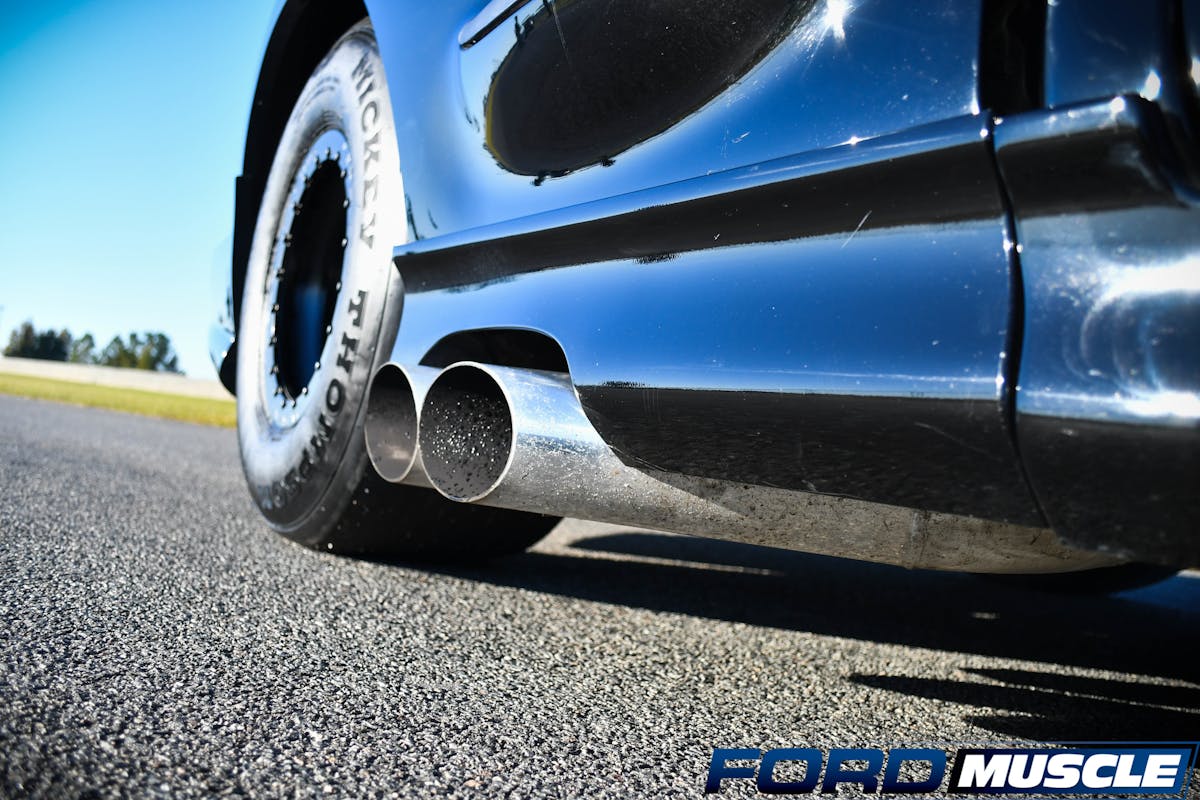 When he lets go of the button, the twin-turbo-5.4 delivers the goods to the pavement via a custom four-link rear suspension by MRC, with weight transfer help from a front suspension fitted with Stifflers upper and lower control arms, and AFCO coilover shocks.