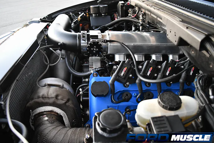 The single snail was just the first step down the slippery slope to an engine build and more boost. He commissioned Bob Vaulding at RPE Performance Engines to construct a 330 cubic-inch, 5.4-liter DOHC modular engine based on the aluminum block and four-valve cylinder heads from the first-generation Ford GT. Filled with stout internals, it breathes in boost through an MMR Roadrunner sheetmetal intake from the pair of 7675 Precision turbochargers. That boost is cooled by a front-mount, air-to-air intercooler, and methanol injection custom built by Hastings. The engine exhales through his custom long-tube headers.