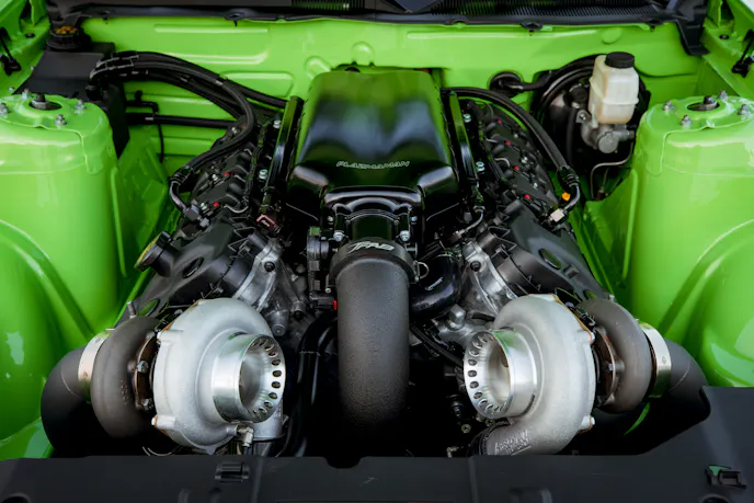 A set of 2,000CC injectors supply fuel with help from three Walbro 465 pumps with JMS Fuel Max to up the voltage and an Aeromotive regulator to return unneeded fuel to the stock tank. The stock throttle body has been modified to use a Vanjen clamp from Vibrant Performance, and sits affixed to a ported Boss intake manifold.