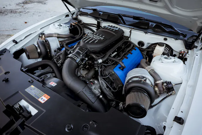 After further assessing the damage with his friends at Mikes Autobody, they agreed the damage was fixable and would still be 100-percent safe. “They did an incredible job as the car has all OEM body gaps and you cannot tell it was ever fixed,” Jim said. He added that he also took the opportunity to add a Roush front bumper and splitter, Boss rear diffuser, and Roush side skirt splitter before having it all repainted in Oxford White.