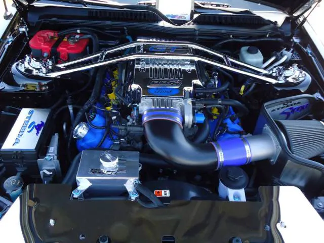 Moucatel’s 2008 GT is sleek, powerful, and dangerous. Modifications include Pypes Violator exhaust, UPR Blue Thunder shifter, 4.10 gears, cross drilled brake rotars, EBC brake pads, STEEDA cold air intake and delete plates, BBK underdrive pulleys, 62 mm throttle body, Accel super coils, NGK iridium plugs, Brenspeed tune, Stack Racing tower brace, BBK chrome plenum cover, Ford Racing etched blue valve covers, UPR polished radiator cover, “Venom” custom pin stripes and rocker stripes, UPR trick shift handle with UPR billet GT knob, custom Ford Mustang headrest inlays, carbon fiber console door, Raxiom smoked tail lights with sequential upgrade, billet front grilles, CDC front aggressive spoiler, Halo driving lights with upgraded Hyper white bulbs, and a hand built trunk panel with remote controlled backlit LEDs.