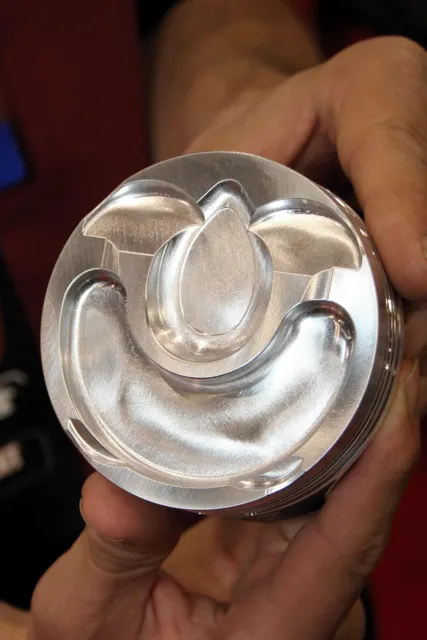 The answer to that question lies in the fact that it’s a direct-injection engine, where fuel is sprayed directly into the combustion chamber, much as it is in a diesel engine. If you’ve been paying attention to Ford’s new Coyote 5.0L, you may also be aware that the head castings for that engine already include a curious bump in the combustion chamber that is the telltale sign of a future switch to direct injection. That means that the same technology seen on this Mazda piston will directly relate to the DI Coyote, when it finally hits a year or two down the line.