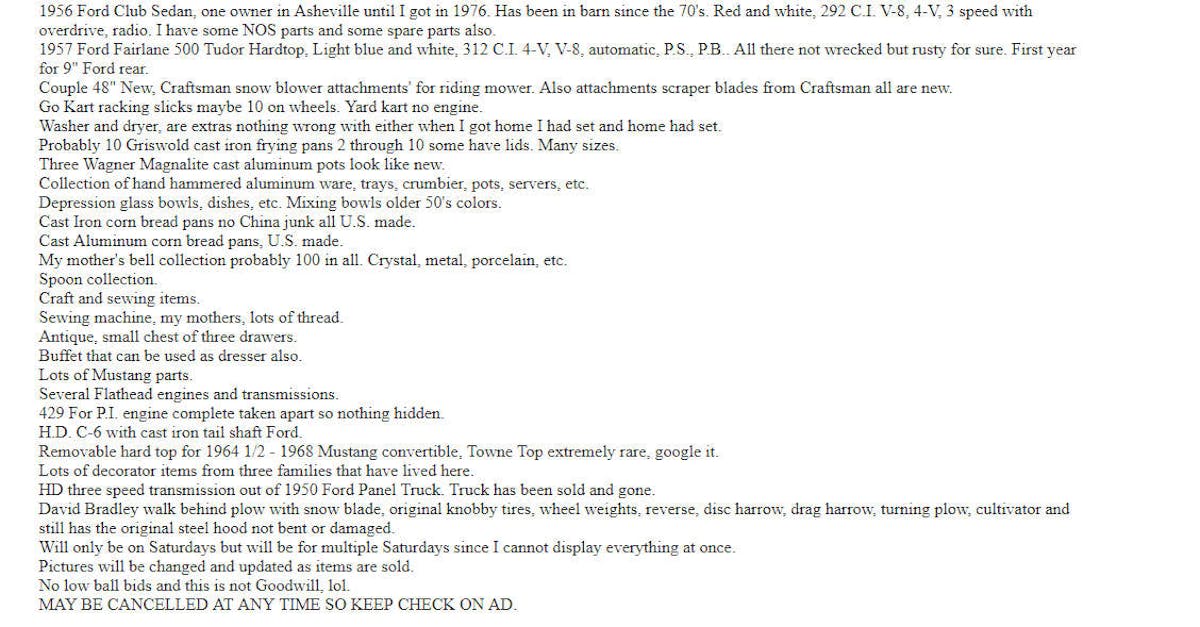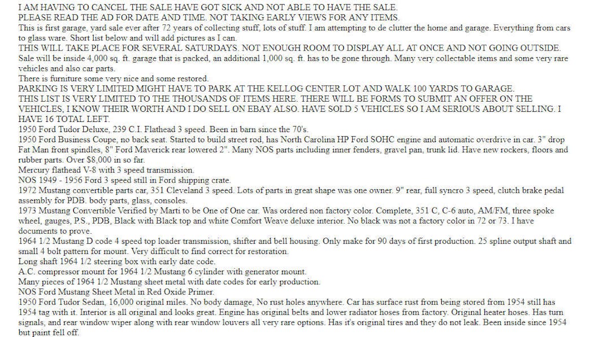 The listing included a wide variety of parts include a Mustang Toploader four-speed manual transmission, a Mercury Flathead V8, and a new, old stock early ’50s Ford three-speed manual transmission just to name a few.