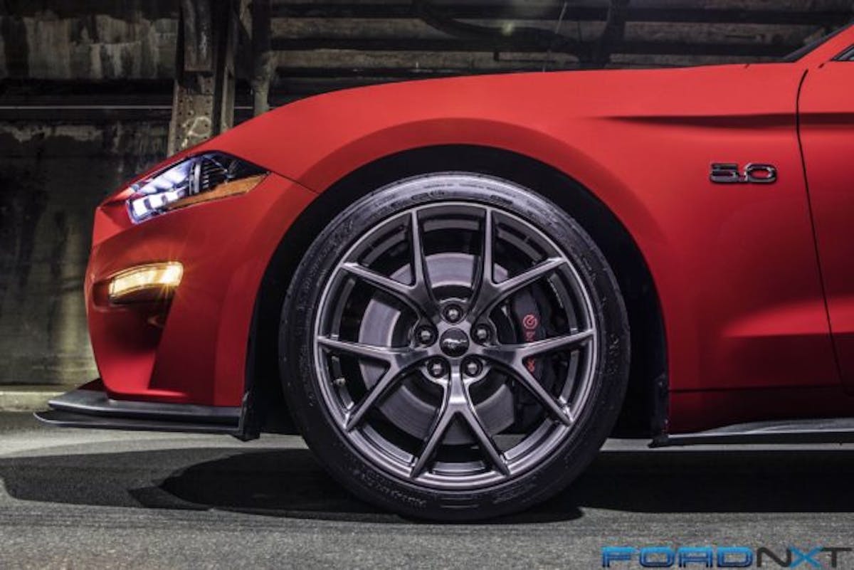 Those 305/30/R19 Michelin Pilot Sport Cup 2 tires are mounted on gorgeous, 10-spoke Dark Tarnish wheels measuring 19×10.5 inches in front and 19×11 inches out back. With this level of traction available, the Mustang’s dynamics engineers leveled-up the Performance Pack.
