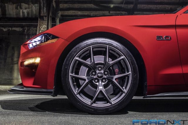 Those 305/30/R19 Michelin Pilot Sport Cup 2 tires are mounted on gorgeous, 10-spoke Dark Tarnish wheels measuring 19×10.5 inches in front and 19×11 inches out back. With this level of traction available, the Mustang’s dynamics engineers leveled-up the Performance Pack.