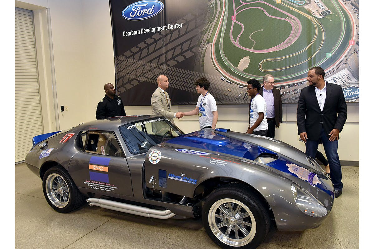 Students from the Detroit Public Schools Community District’s Breithaupt Career and Technical Center spent 18 weeks building one sweet class project recently unveiled at Ford’s Dearborn Development Center — a 1965 Daytona Coupe.