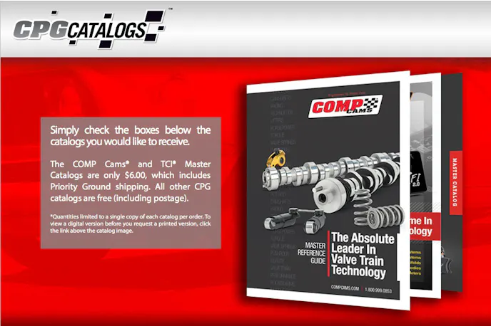 And for you old schoolers who like to have a tangible product in your hand to dog-ear and paperclip favorite pages, you can still check the boxes below the specific catalogs and CPG will send you a catalog for free – including postage. The two Master Catalogs, COMP Cams and TCI, are also available for a small fee of $6.00, including postage.