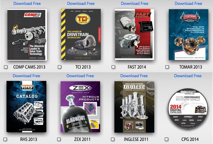 These catalogs include: COMP Cams, TCI Auto (TCI), Fuel Air Spark Technology (FAST), Tomar Racing Clutches by Quarter Master, Racing Head Service (RHS), ZEX Nitrous Products and Inglese. Also available on their site is the 2014 New Products Digital Catalog, available for download as well.