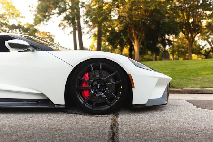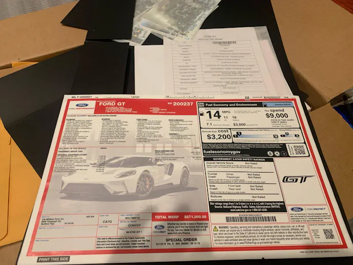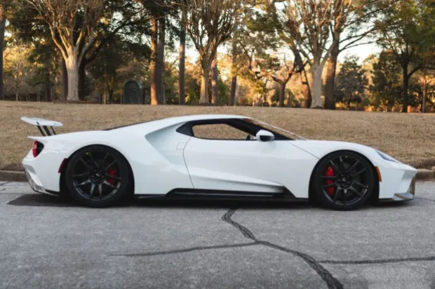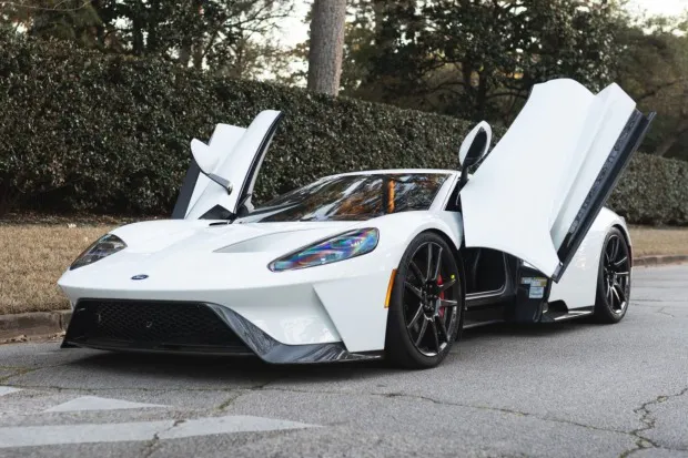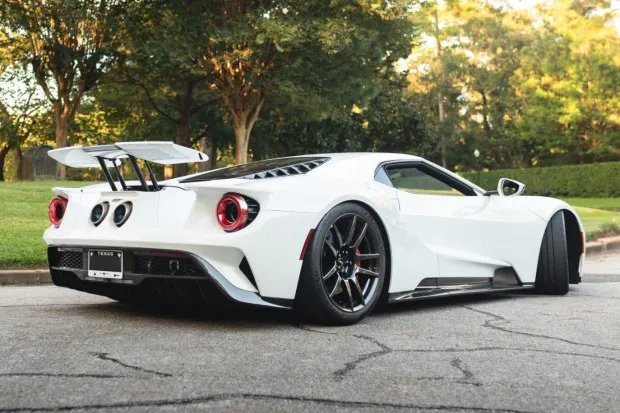 The seller reveals key details of this particular example, “This 2019 Ford GT was purchased new by the seller from Pat Milliken Ford of Redford, Michigan, in November 2019. The car is finished in Frozen White over a black leather Dark Energy interior. Power comes from a mid-mounted, twin-turbocharged 3.5L EcoBoost V6 paired with a seven-speed dual-clutch transaxle. Features include red-painted Brembo brake calipers, carbon-ceramic rotors, 20” gloss exposed carbon-fiber wheels, gloss carbon-fiber exterior trim, a front axle lift system, six-point harness anchors, a leather-wrapped steering wheel, and a titanium exhaust system. This second-generation GT has 1,400 miles and is now offered with a window sticker, an accident-free Carfax report, and a clean Texas title in the owner’s name.”