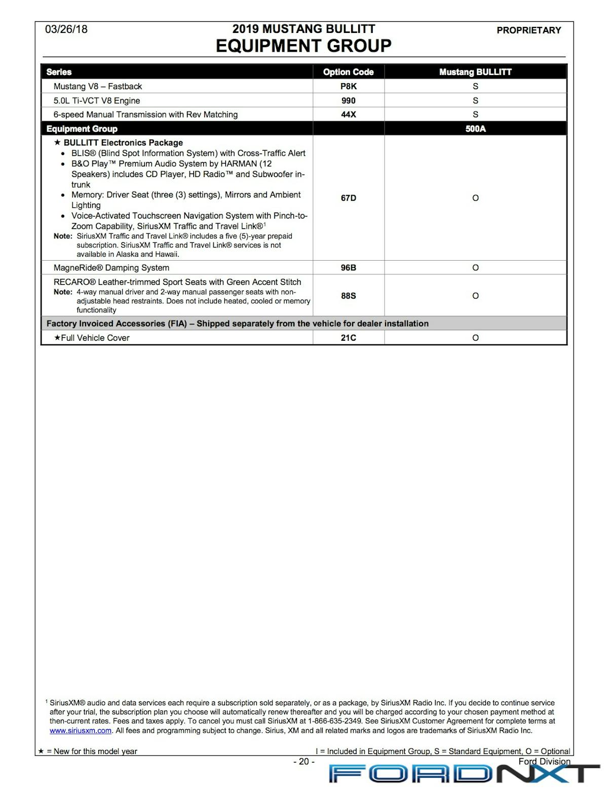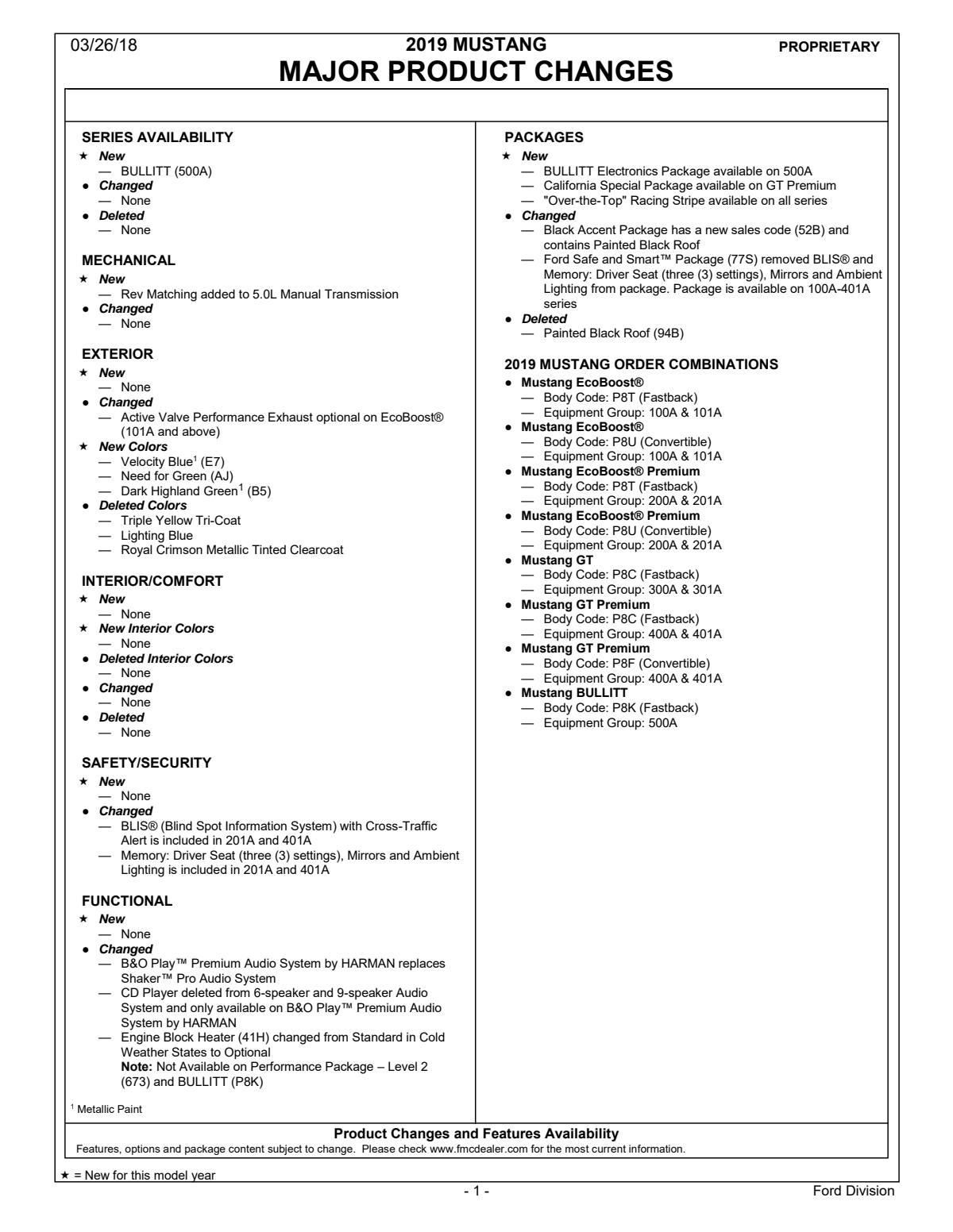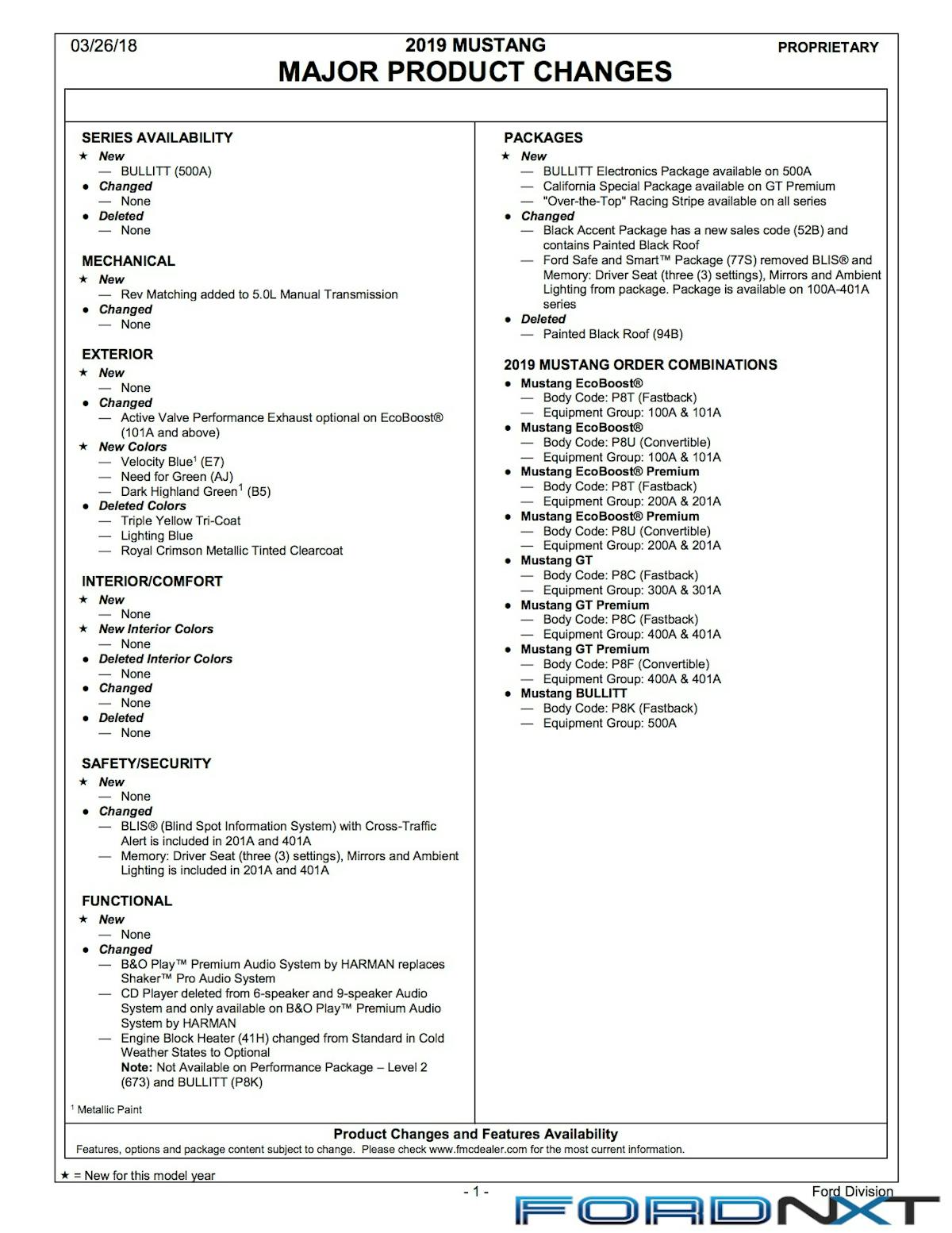 Since the beginning of the year we have learned quite a bit about the 2019 Mustang and its specialty variants. From new options like Need For Green paint and B&O Play audio to reimagined packages like the Bullitt (500A) and California Special, there are a lot of things to consider when buying a new Mustang. As luck would have it, the dealer order guide for the 2019 recently hit the web to give you a head start on the choices.