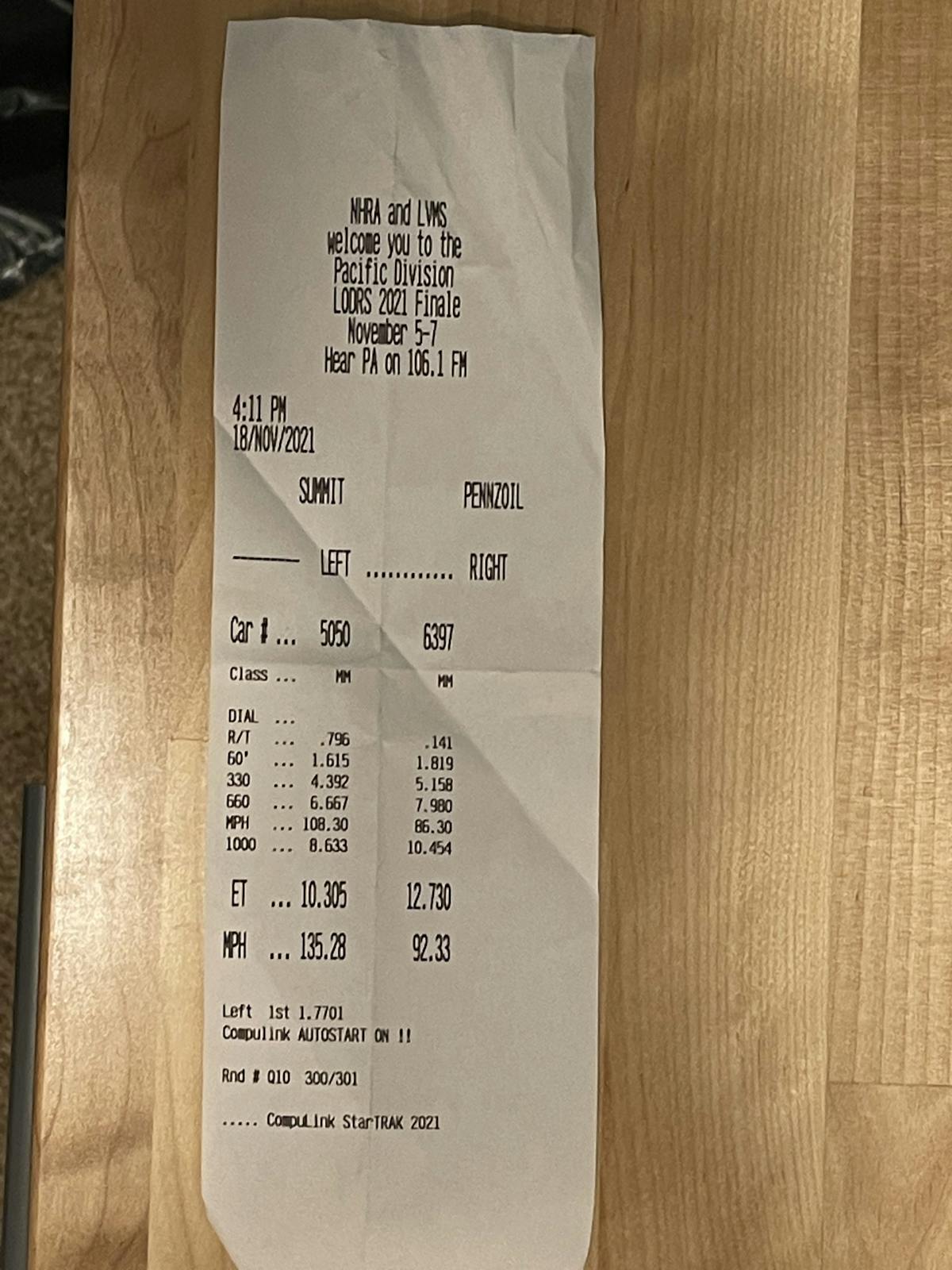 I let the car cool and on the next pass, I bumped the launch RPM but it spun off the line as the track was starting to go away as the temperature dropped (and HP was increasing). I continued to drop launch RPM on each successive pass, but it was a losing battle. I literally finished the night leaving at 1,200rpm with the launch control and it still spun. That was the lowest setting and it sounds very strange when you are on the transbrake, in case you are wondering. Our night was over.