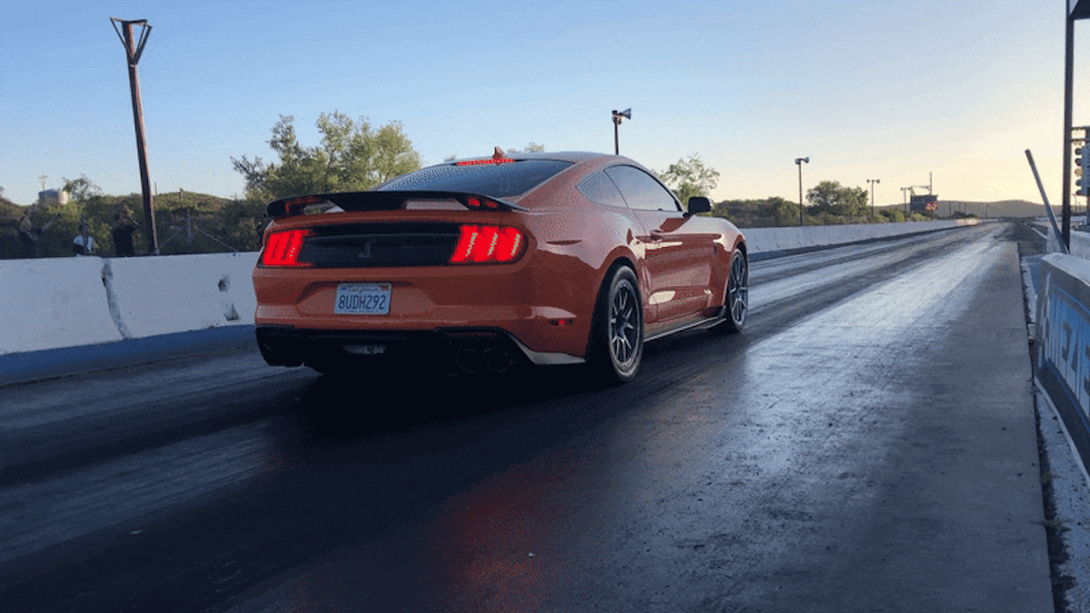 Our Shop Manager Dean Jigamian was my faithful companion on this journey, who helped make sure the 2020 GT500 was topped off with Renegade Pro E85 to ensure a consistent fuel mix during testing, that the Mickey Thompson ET Street R Drag Radials (325/35R18) were aired down to 18psi, and the Forgeline 18-inch wheels were safely secured to the hubs. I familiarized myself with the GT500’s track apps, including the line lock and launch control. After taking a walk to the starting line, it appeared the track was pretty sticky when it opened at 5pm. So I set the launch control for 2,500rpm, hoping for the best.