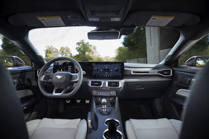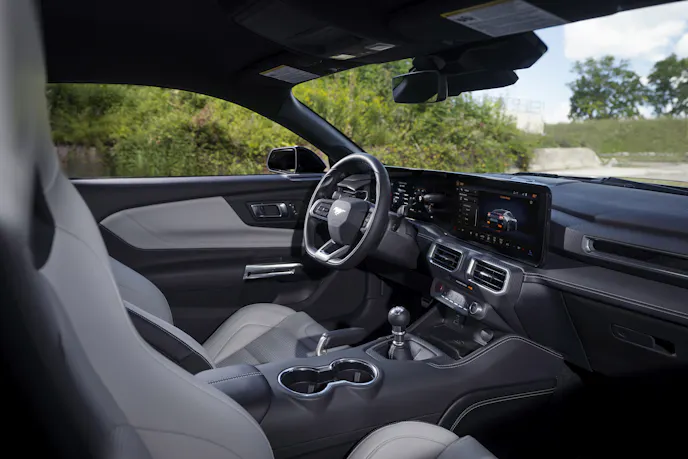 The new engines are paired with familiar transmissions. The 2024 Mustang GT gets both the MT-82 six-speed manual and the 10R80 10-speed automatic with traditional shifters — no dial shifters on the S650! Meanwhile, the EcoBoost is only paired with the 10-speed auto.