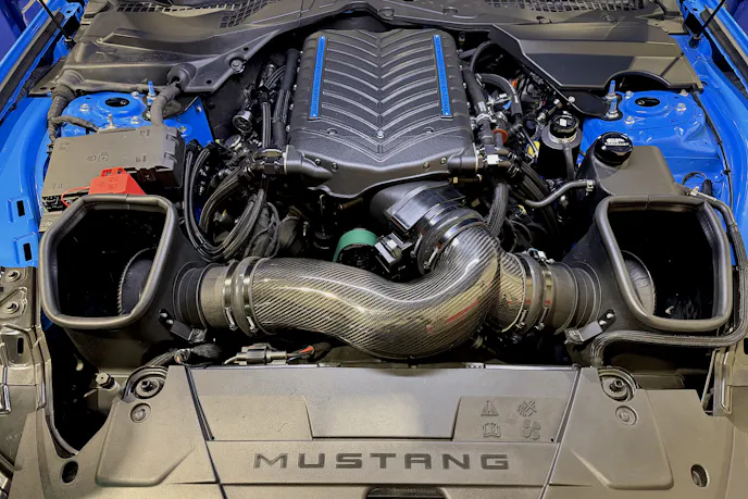 From inside the cockpit, the sounds were also familiar as the built 10-speed automatic blurred through each gear, and the satisfying sound of a whining blower feeding a high-revving Coyote with boost filled the driver’s ears. But it wasn’t the same blower that had just boosted this car to an 8.46-second rip. There was something bigger and badder under the hood.