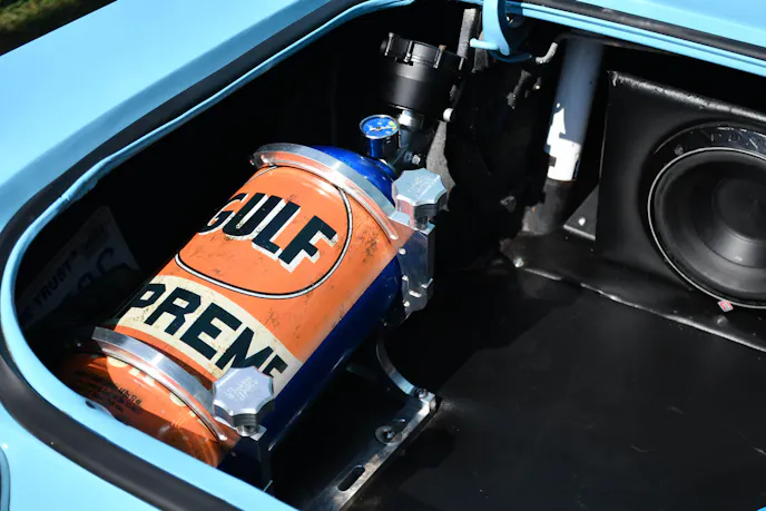 As soon as the Gulf livery-painted coupe roars to life, the unmistakable sound of a 331 cubic-inch engine fills the air. When it hits the course, the car unleashes a surge of power, with seamless shifting. As for its suspension, the car has been upgraded with a custom-built four-link setup in the rear, featuring Global West upper and lower control arms. All four corners are equipped with QA1 suspension components. And should the need for additional power arise, Jones has a 125-shot of nitrous on board for those exhilarating trips down the drag strip.