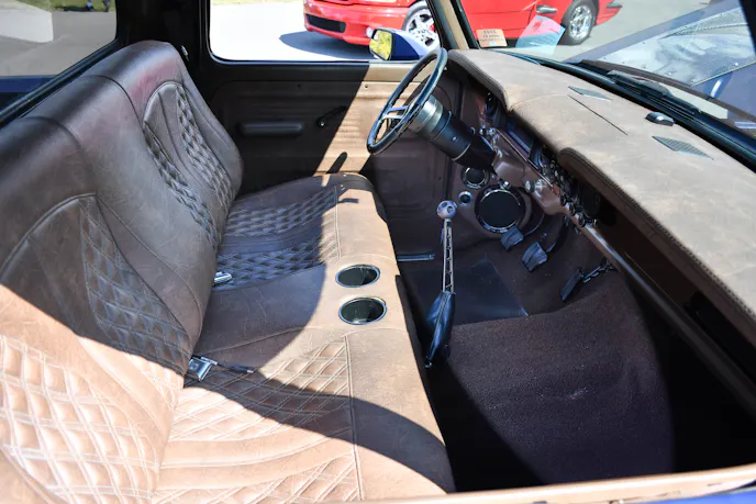 The build didn’t stop with suspension and drivetrain, though. Johnson addressed creature comfort and aesthetics alike. The interior was reupholstered, and all the windows were replaced with new units. The window felt and chrome trim were replaced as well. When I think of a cool cruiser, it’s hard to beat the looks of the early F-100’s, especially with the original cabin cooler poking up just beyond the hood.