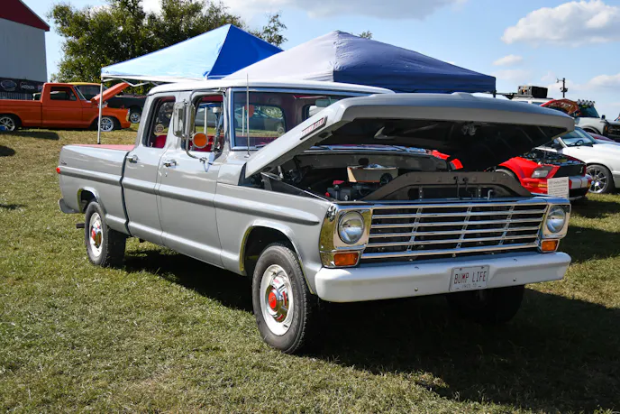 The truck retains a 390 cubic-inch FE engine but has been bored .030-inches over and has an RV camshaft installed. The engine is paired with a C6 automatic transmission. The rear houses a Dana 60 with 3:73 gearing. Although the truck only gets 10 mpg when not towing and 6 mpg with a camper behind it, Leonard still uses the truck everywhere he goes.