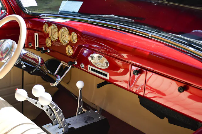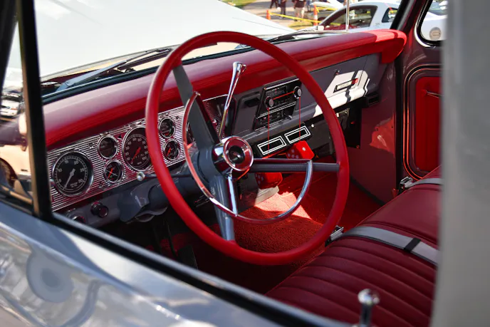 The build didn’t stop with suspension and drivetrain, though. Johnson addressed creature comfort and aesthetics alike. The interior was reupholstered, and all the windows were replaced with new units. The window felt and chrome trim were replaced as well. When I think of a cool cruiser, it’s hard to beat the looks of the early F-100’s, especially with the original cabin cooler poking up just beyond the hood.