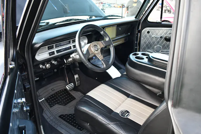 While addressing the drivetrain and suspension is how most truck builds begin, Henke took it a step further with his custom exterior. The front bumper consisted of three original bumpers that were filled in the center and wrapped around the front end. A custom splitter made from ABS plastic adds aggressive aesthetics. In the rear, a Chevrolet C10 bumper was flipped and notched for the license plate and exhaust. The F-100’s bed features Seadeck boat flooring. This Avery vinyl Satin Midnight wrap stood out from the crowd and made for one sweet ride.