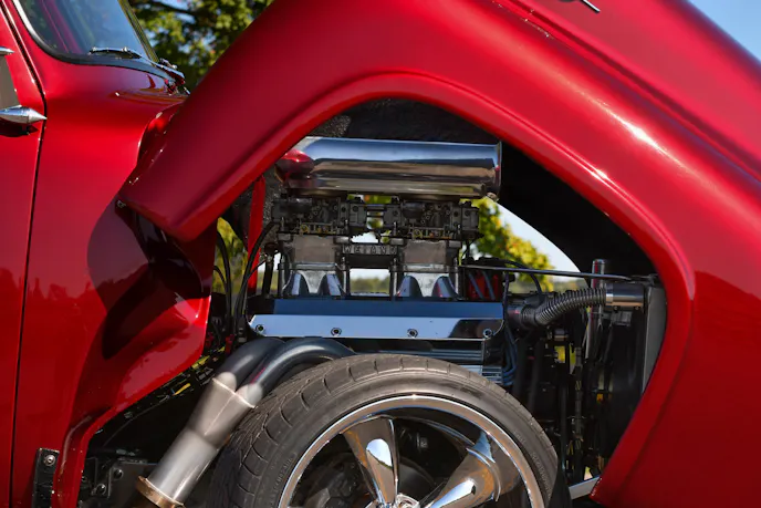 There are certain trucks that just shine with elegance. Brent Poole’s 1955 Ford F-100 did just that when the sun hit the truck, and my eyes were drawn closer. The paint, body, and interior were all top-notch. With a flick of a switch, the truck’s one-piece front end lifts forward, and you can see its clean 429 cubic-inch big-block Ford. The engine was stuffed with a Schneider custom grind roller cam and topped with a Weiand tunnel ram setup and custom-made headers that wrap around the frame.