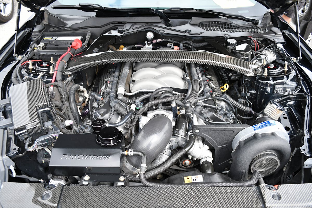 Robert Hersh Jr.’s Mustang not only boasts an aggressive appearance, with its 4-inch Cervinis cowl hood, MP Concepts GT500 front bumper, and carbon fiber rear louvers, but it also excels in the performance department. Beneath the hood, you’ll find an ESS Tuning G3 supercharger kit, fine-tuned by Lund Racing, nestled alongside the 5.0-liter Coyote engine.