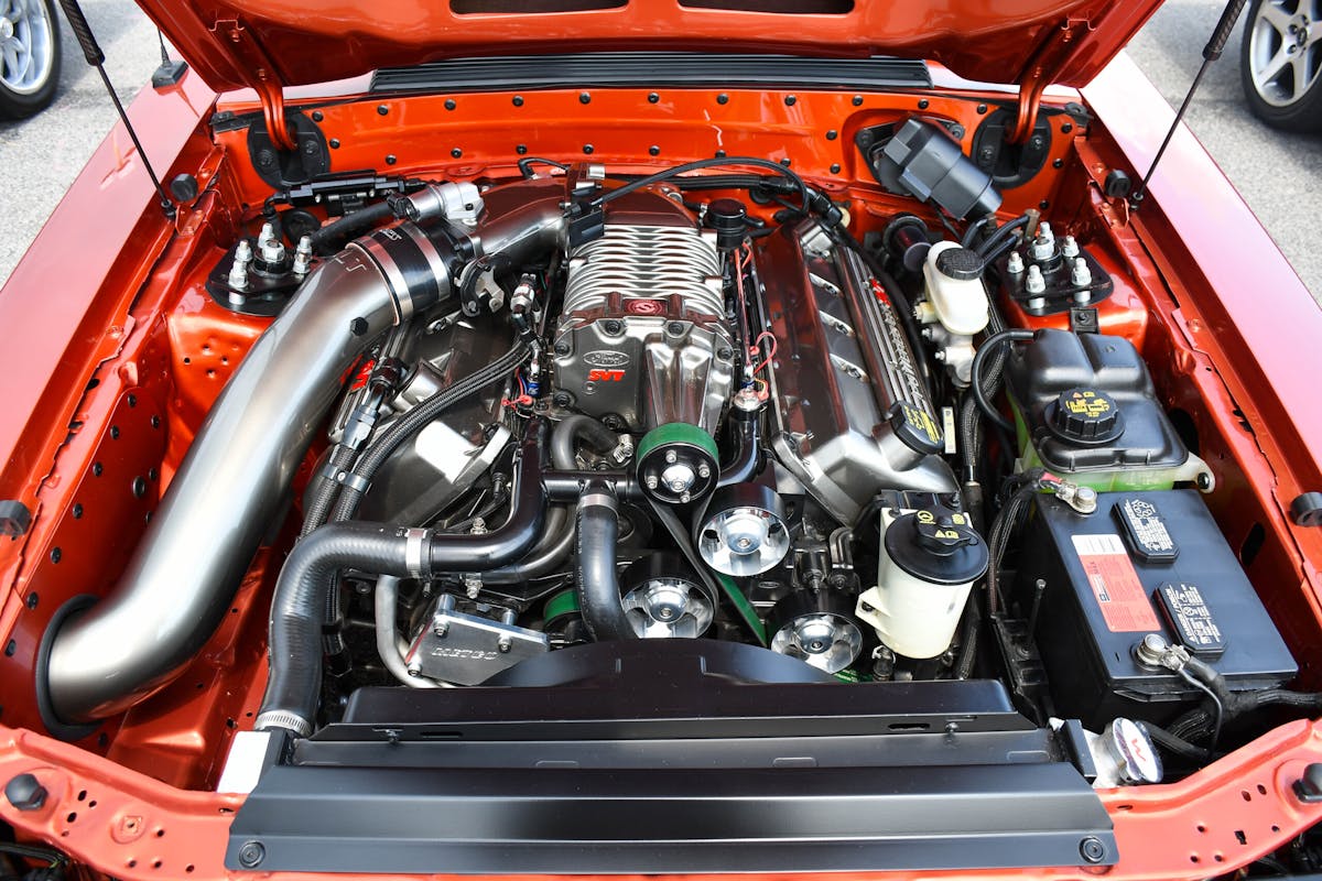 If you wander through the show car field of Mustang Week, you begin to notice certain trends: centrifugal superchargers on Fox Body Mustangs, Torq Thrust wheels on vehicles owned by those over 50, and the list goes on. However, when you lay eyes on Jonathun Catapano’s stunning Mustang, everything you saw before fades from your mind. The bright red custom widebody, adorned with fender flares and molded side skirts, perfectly complements the polished CCW Classic wheels. Thanks to the RideTech air bags and management system, the car sits at a nice stance. But it’s not just the paint, wheels, and suspension that drew everyone to this build.