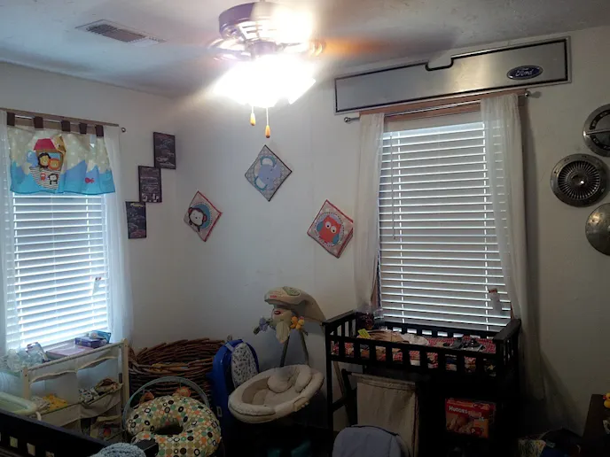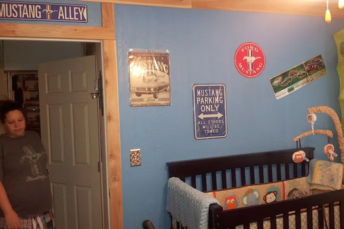 Having a large collection of Mustang, Ford, and car related toys and memorabilia and looking to pass the car bug onto their new son, the Mullins decided to decorate their soon to be born baby boy’s room in a Mustang theme. “I have a vast collection of Mustangs toys (over 200 hotwheels and 30 big diecast) so I figured why not make my sons room a Mustang room and put up signs and cars. What red blooded American boy wouldn’t love that.” Mixed in among the typical baby decor is an assortment of Mustang and Ford related signs, posters, hubcaps, license plates, emblems, and even the tailgate panel from a Ford pickup.