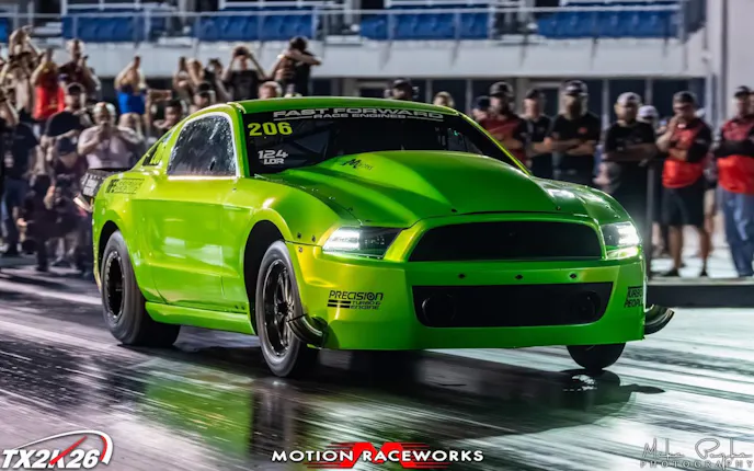 His combination evolved into a proven performer that teams big turbo boost with a stout Fast Forward Race Engines-built Coyote, and a sorted chassis that consistently applies the four-digit output to the track surface. The result is repeatable 5-second performances at over 240 mph, which is territory few cars, regardless of engine platform, can reliably occupy.
