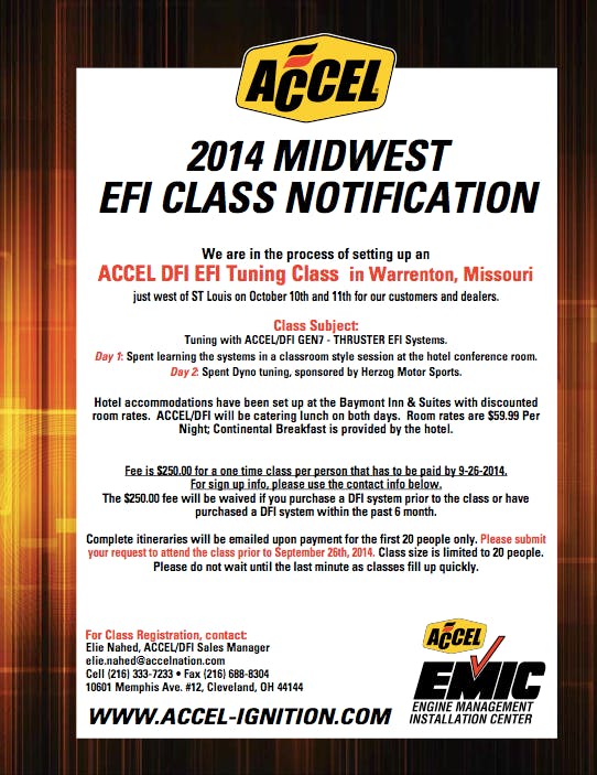 The company is offering an ACCEL DFI EFI Tuning class coming up on October 10th and 11th in Warrenton, Missouri, near St. Louis. The class size is limited, and accommodations have been set up with discounted room rates for the first 20 paid attendees. Class length is two days, with the first spent in the classroom discussing theory and diving into the inner workings of the system’s capabilities.