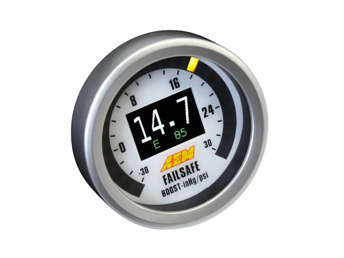AEM’s Flex Fuel Wideband FAILSAFE Gauge’s feature a vibrant Organic LED (OLED) center readout that can be user-programmed to display AFR/Lambda and Ethanol Content, Boost/Vacuum and Ethanol Content, or a single input of either AFR/Lambda or Boost/Vacuum. The 24 sweeping outer LED ‘needles’ can be programmed to display AFR or Boost/Vacuum, and corresponding faceplates are included for matching the inputs to the proper display layout. A silver bezel is also included to further customize the look of the gauge face.