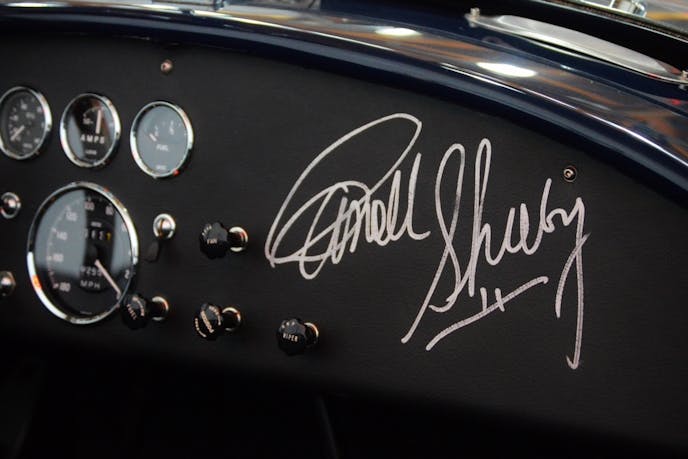 Along with period-style racing harnesses, you’ll find Carroll Shelby’s signature displayed on the vinyl finished dashboard, as well as an optional heater/defroster system and a fresh-air-vent for the driver.