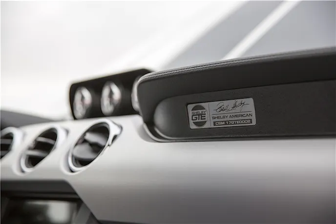 Sporting its official Shelby American CSM 17GTE0002 plaque, this exceptional GTE features a few key revisions that won’t be shared with the future GTE models produced. For example, a custom charcoal carbon-fiber stripe package, and a Platinum White Metallic powder-coated Kenne Bell twin-screw supercharger to match the car, were added into the mix.