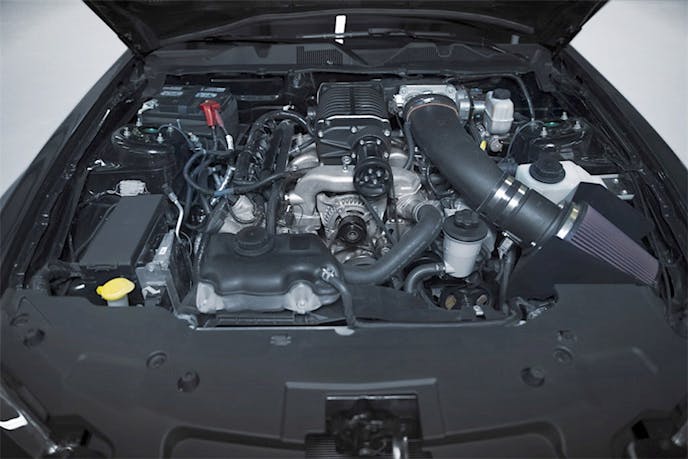For this special build the Mustang RTR team performed the aforementioned carbon-fiber makeover, along with adding 20-inch, carbon fiber HRE wheels, which were a $25,000 option. Furthermore, this Mustang’s Three-Valve 4.6-liter engine is rocking a Ford Performance Whipple supercharger, making it good for more than 550 horsepower.