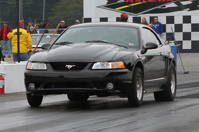 The car he takes into battle is this 2000 Mustang GT, but under the hood is something you may not expect. It’s a 351 Windsor with Total Engine Airflow-ported Trick Flow Twisted Wedge Heads, a Jay Allen cam, an Edelbrock Super Victor intake, and an EZ Plate restrictor plate system; all fed by an Aeromotive fuel system. Wittenauer uses the EZ Plate system to dial-in to his desired index. Behind the Windsor is a home-built C4 with a Bradco converter, and a built 8.8 with a Moser spool and 33-spline axles, and 4.10 gears.