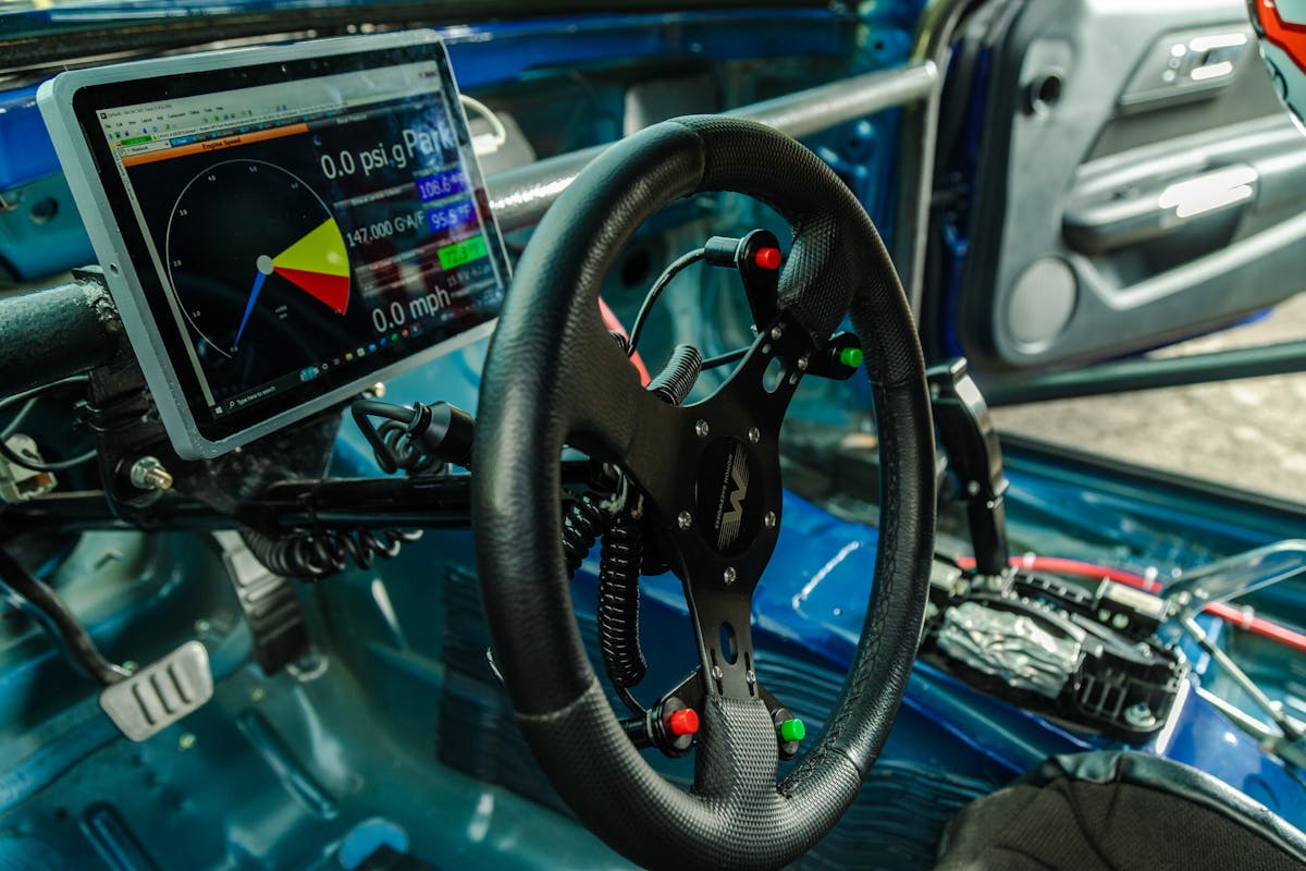 Spartan describes the interior of Jessie Ringley’s 2015 EcoBoost Mustang, which shed anything that wasn’t involved with making the car faster. Under the command of a Motec m142 calibrated by PD Tuning, which also controls the 6R80 six-speed automatic in the tunnel fitted with an EMS-modified stock torque converter.