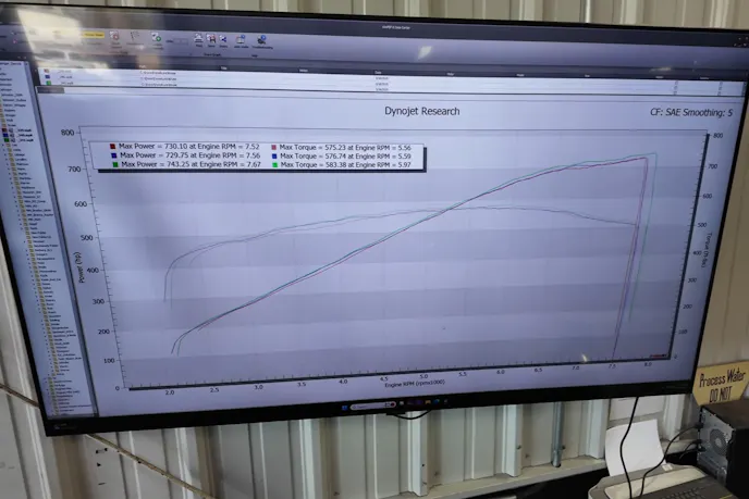 The dyno results validated the approach. After letting the efficient Whipple system cool slightly between runs, the Mach 1 put down strong numbers: 743 horsepower and 583 lb-ft of torque to the wheels. Matt considered this “really good power for pump gas” and typical for the efficient Gen 6 Whipple setup.