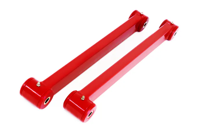 Launch harder, reduce wheel hop, and add cornering consistency to your 2005-2014 Mustang with Lower Control Arms from BMR Suspension. These budget control arms are manufactured from 1×2-inch steel tubing, which increases strength over the stock arms, while remaining an economical option for improved handling. The BMR Lower Control Arms (PN TCA032) use 2.0-inch greasable, high-durometer, internally fluted, polyurethane bushings, adding a solid, more responsive feel over the factory rubber bushings. These are the perfect upgrade for the enthusiast looking to improve handling, while maintaining near-stock NVH and ride quality. Installation time is 2-3 hours. Available in black hammertone or red powder coat.