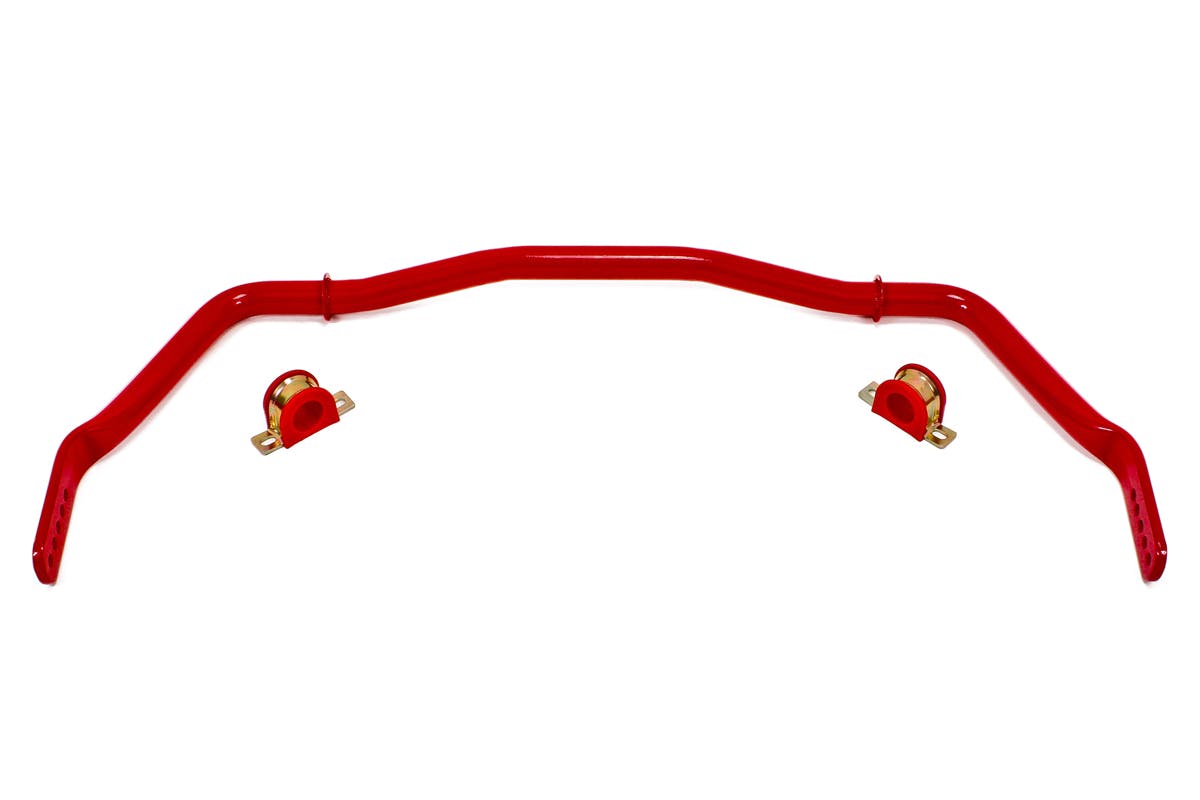 Improve handling, reduce body roll, and increase cornering stability with an adjustable front sway bar for the S197 Mustang from BMR Suspension. Designed from 38mm DOM tubing, the BMR front sway bar is cold formed to better resist torsional fatigue and retain “memory” far longer than conventional hot-formed bars. The BMR Adjustable Front Sway Bar (PN SB041) gives you a 62%-297% increase in sway bar rate over the stock bar (depending on year and model). BMR Suspension designed this adjustable sway bar for street performance, autocross, and road race applications. The SB041 has five positions, giving you the versatility to drive to and from the track and out handle the competition with the same sway bar. These stiffer settings allow you to fine-tune the suspension so you can drive harder and minimize body roll in any cornering situation. Installation time is 1 hour. Available in black hammertone or red powdercoat.