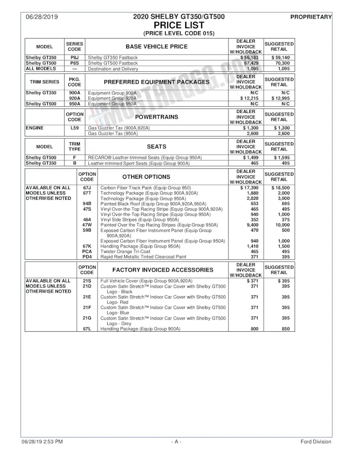 We’ve obtained MSRP pricing list for the 2020 Shelby GT500 and GT350 including options and accessories. Ford has confirmed the document shared by Mustang6g is legitimate and that sticker pricing for the 2020 Shelby GT500 is set at $73,995 with $1,095 destination fee and $2,600 gas guzzler tax.