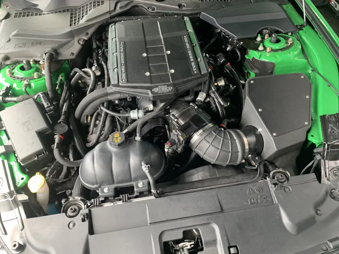 The supercharger received a complete CNC port job and a 112mm throttle body from Kong Performance. American Racing Solutions developed a 10-Rib Belt System with input from Cook exclusively for Evolution Performance, which was also added.The system utilizes an air-to-water intercooler fitted with a larger PNR Welding ice tank and high-flowing EMP intercooler pump.