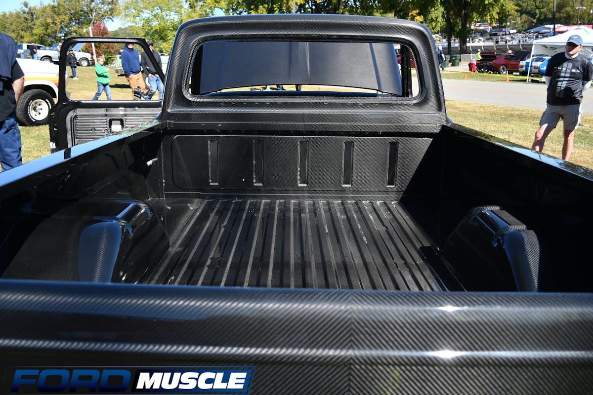 Although the skills used were nothing out of the ordinary for Brothers Composites, it stands out from any other build the early F-series segment has ever seen. Only the frame, inner steel of the cab, and door shells remain from the original truck. The complete bed, tailgate, and underside braces are all carbon fiber and come out to only 133 pounds. The door skins, back panel, drip rails, and roof are all bonded carbon to the inner steel. The inside door panels, transmission cover and cowl are carbon, as well. The A-pillars provided another added layer of difficulty as they were modified and expanded over the steel structure. The front receives the same treatment with carbon fiber fenders, fender brace, and a constantly rusted out inner apron.