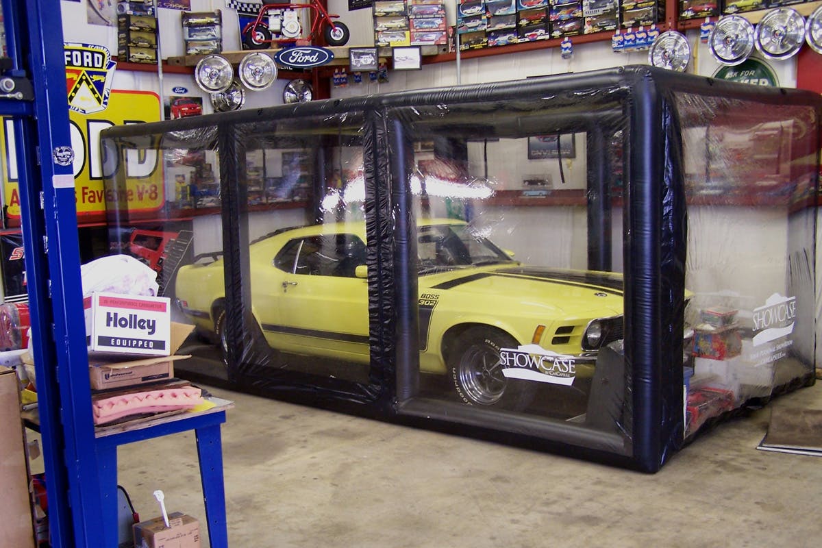 CarCapsule is pleased to introduce the ShowCase, an ultra-premium vehicle storage shelter, and the next evolution of CarCapsule technology. The luxury ShowCase seals your treasured vehicle away from dings, dust, dirt, corrosion, mildew, musty odors, and pests, while presenting it in a show quality display. Described as a “Touchless Car Cover”, ShowCase provides ultimate protection, yet never touches the vehicle. ShowCase is supported by heavy duty and resilient inflatable air columns, and features a front panel which zips open and away, allowing the vehicle to simply be driven in or out. The side panels zip open as well, providing easy walk-in access and enabling vehicle doors to be opened without interference. Using CarCapsule’s proven Evaporative Storage System (E.S.S.) technology, air inside the ShowCase is exchanged with filtered outside air 3-5 times every hour, keeping the temperature inside consistent with the temperature outside and eliminating moisture that could condense on the vehicle. ShowCase features durable 10 mil PVC windows and an 18 mil PVC floor that is mildew, abrasion and flame resistant, as well as impervious to oil, gas and antifreeze. Easy one-step set up; simply attach the included air pump and the ShowCase is ready for use in 3-4 minutes. Go to https://youtu.be/sDPdMHWdzC4 for a demonstration. Offered for automobiles, motorcycles or as a solution for most any situation that requires a dust-free, and dry storage shelter. Custom configurations, made to customer specifications, are also available.