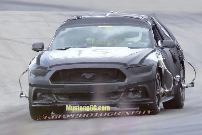 The guys at Mustang6g are at it again, and while just yesterday we brought you their latest renderings done by Wild Speed, today we find that they’ve actually managed to get their hands on what the front of the Blue Oval’s new pony car will look like. Mustang6g paid for spy photos of the 2015 S550 Mustang doing track testing without the full front end camo. Mustang6g has given us permission to use one photo and ask you to go to their site for the rest.