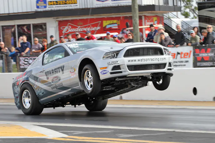 Friday saw three qualifying sessions, at the end of which record-setting Super Stock racer Chris Holbrook found a spot on the top of the qualifying sheet with a stout 8.50 at 158 MPH to lead the field into Saturday’s elimination sessions. Local Florida racer Mike Skinner qualified second with an 8.79, while Bo Butner’s 2014 Cobra Jet was good in its shakedown sessions for a 9.85. Anthony Bongiovanni took fourth with an 8.63, while Rod Heltzel took both the fifth qualified position and the long-haul award (he’s from Jacksboro, TX) with an 8.69. Remember, these cars are qualified on how much quicker they run than their index, and Holbrook’s 1.479-second decrease from his 10.00 index is simply staggering.