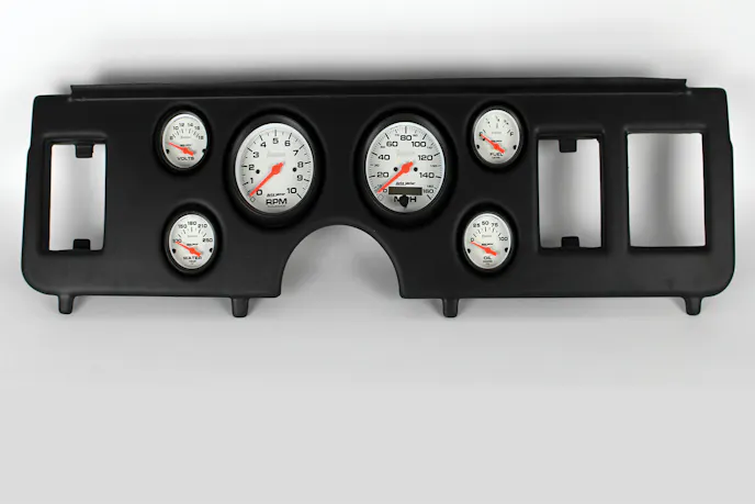 The panels come with two 3-3/8″ openings for the tach and speedometer, plus four 2-1/16″ apertures for auxiliary gauges; most enthusiasts opt for short sweep oil pressure, water temperature, voltage and fuel level—although others are available. They are a direct bolt-in replacement for the OEM panel, and accommodate factory accessories and trim.