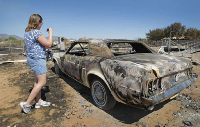 This classic Mustang was one of the many automotive victims of the Wallow Fire. The car belong to Stephanie Jaco’s mother, pictured her taking a picture of the damage, probably to send to insurance companies who will hopefully cut her a check. Rack up another lost Mustang for the scrap heap. At the end of the day though, it is still just a car, and nothing can replace the happy memories we hope this Mustang harbored. Still, we can’t imagine leaving our classic ‘Stang in the path of an all-engulfing fire. Can you?