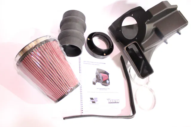 Competition Air Inlet Upgrade includes roto-molded open airbox, rubber hood seal, large cone-style air filter, bellmouth-entry filter adapter, silicone coupler, instructions, and all required mounting hardware. It replaces the OEM air filter cover, filter, and base, and mates to the OEM body-mounted cold air snorkel.
