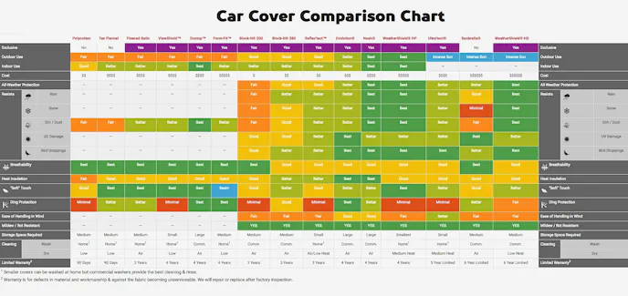 This comparison chart is an interactive guide that allows you to pick and choose which option fit your cars needs. There are numerous ways to customize your search including price, amount of protection required, and even the amount of space that may be needed to store your cover when not in use. It includes the features of 15 of the most popular car covers in their lineup, and the full color-coded, drop-down chart makes it easy to find a cover that will protect your build.