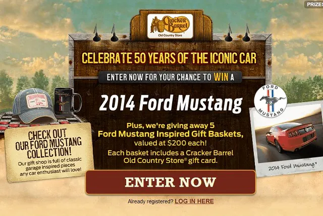 To help celebrate the 50th anniversary of the Ford Mustang, Cracker Barrel is giving away a brand new Ford Mustang. No, not a 2015 model, but rather a 2014 model, but it’s not like anyone is going to complain about getting a free Mustang, and if you’re good at social media, you can increase your odds of winning.